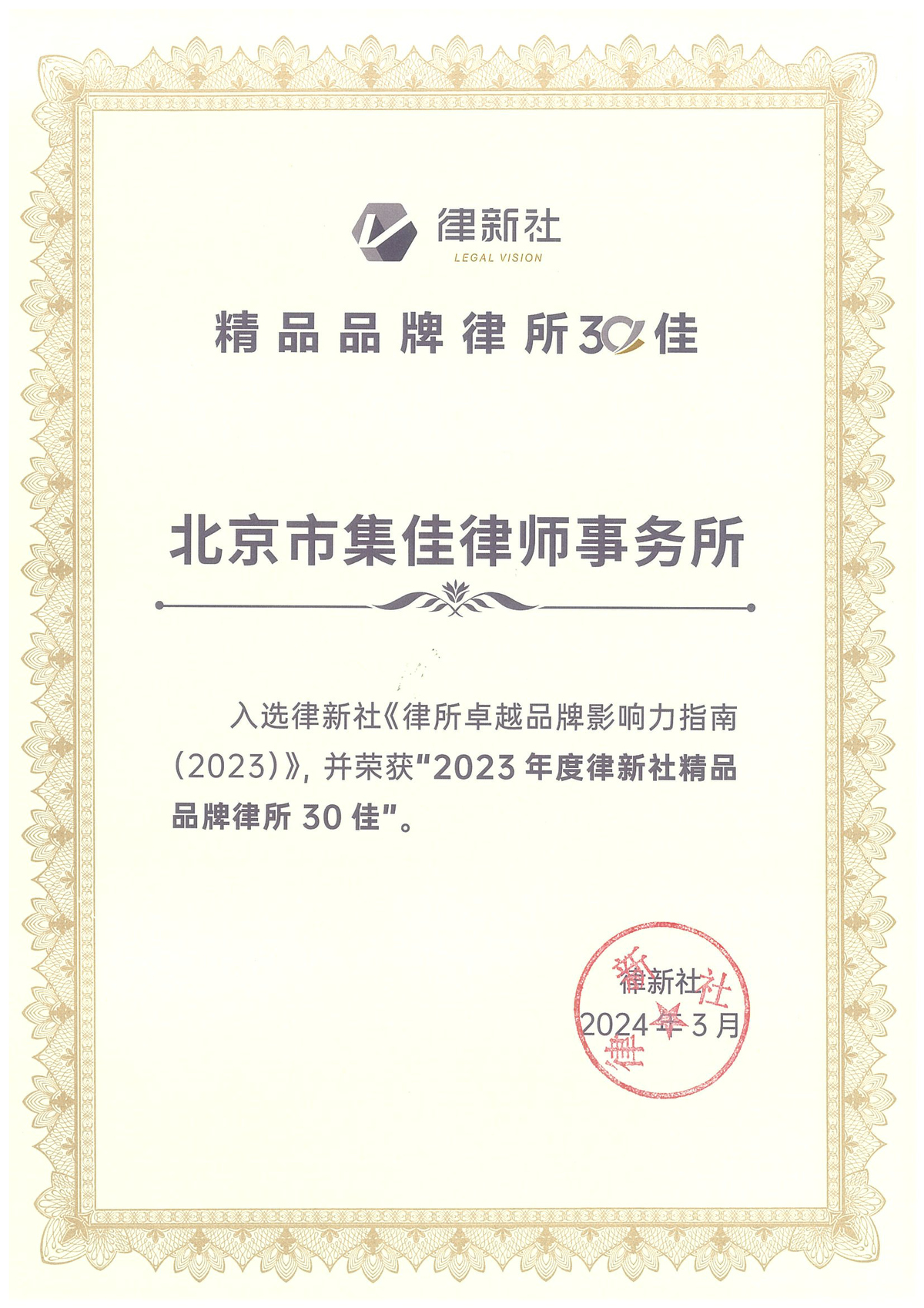 集佳律所入選 “2023年度律新社精品品牌律所30佳”