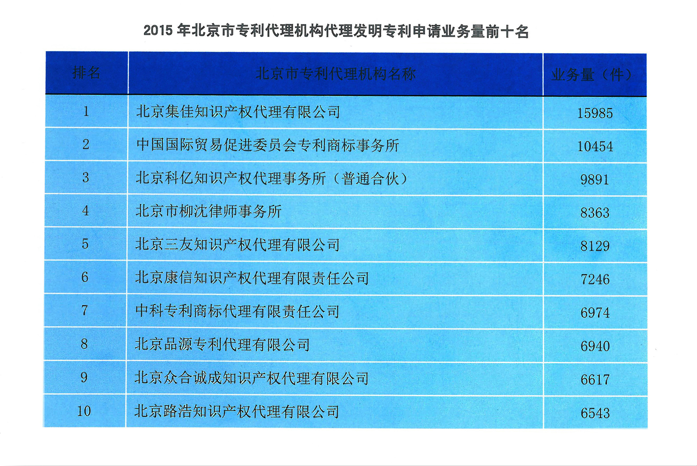 2015北京市專利代理年報發(fā)布 集佳代理發(fā)明專利申請量再次榮登榜首