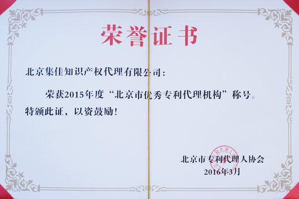 集佳獲評“2015年度北京市優(yōu)秀專利代理機(jī)構(gòu)”