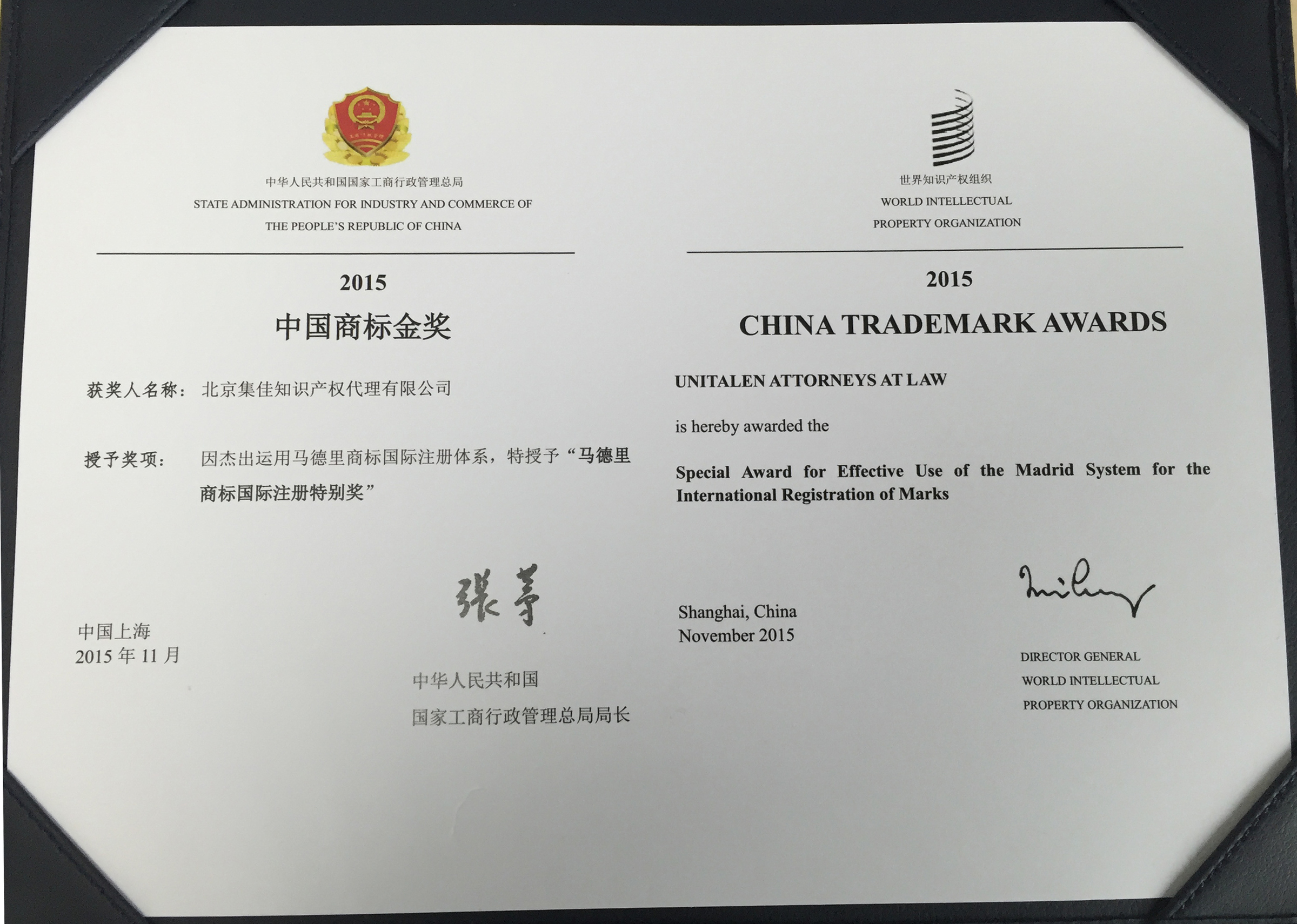 集佳榮獲“馬德里商標(biāo)國際注冊特別獎”
