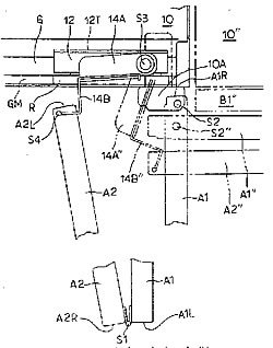 | 25 | 實(shí)用新型 | 門(mén)的開(kāi)關(guān)機(jī)構(gòu) | 本發(fā)明提供可以把折疊式門(mén)打開(kāi)大于90度角的門(mén)的開(kāi)關(guān)機(jī)構(gòu)。柜體(10)形成的開(kāi)門(mén)部位至少有要開(kāi)關(guān)一部分的相鄰的兩扇門(mén)A1、A2,以上下方向的第1軸S1為中心連結(jié)在一起,并可以相互轉(zhuǎn)動(dòng),一扇門(mén)A1具有以遠(yuǎn)離上述第1軸一側(cè)A1R附近上下方向的第2軸S2為中心與柜體連結(jié),并能相對(duì)柜體轉(zhuǎn)動(dòng)的折疊式門(mén)A,以及沿柜體開(kāi)口部位左右方向移動(dòng)的移動(dòng)件12,以上下方向的第3軸S3為中心與上述移動(dòng)件連結(jié),并能相對(duì)上述移動(dòng)件轉(zhuǎn)動(dòng)的轉(zhuǎn)動(dòng)部件14A、14B。上述折疊式門(mén)的另一扇門(mén)A2以在遠(yuǎn)離上述第1軸一側(cè)A2L附近的第4軸S4為中心,連結(jié)上述轉(zhuǎn)動(dòng)部件,并可以相互轉(zhuǎn)動(dòng)。 |