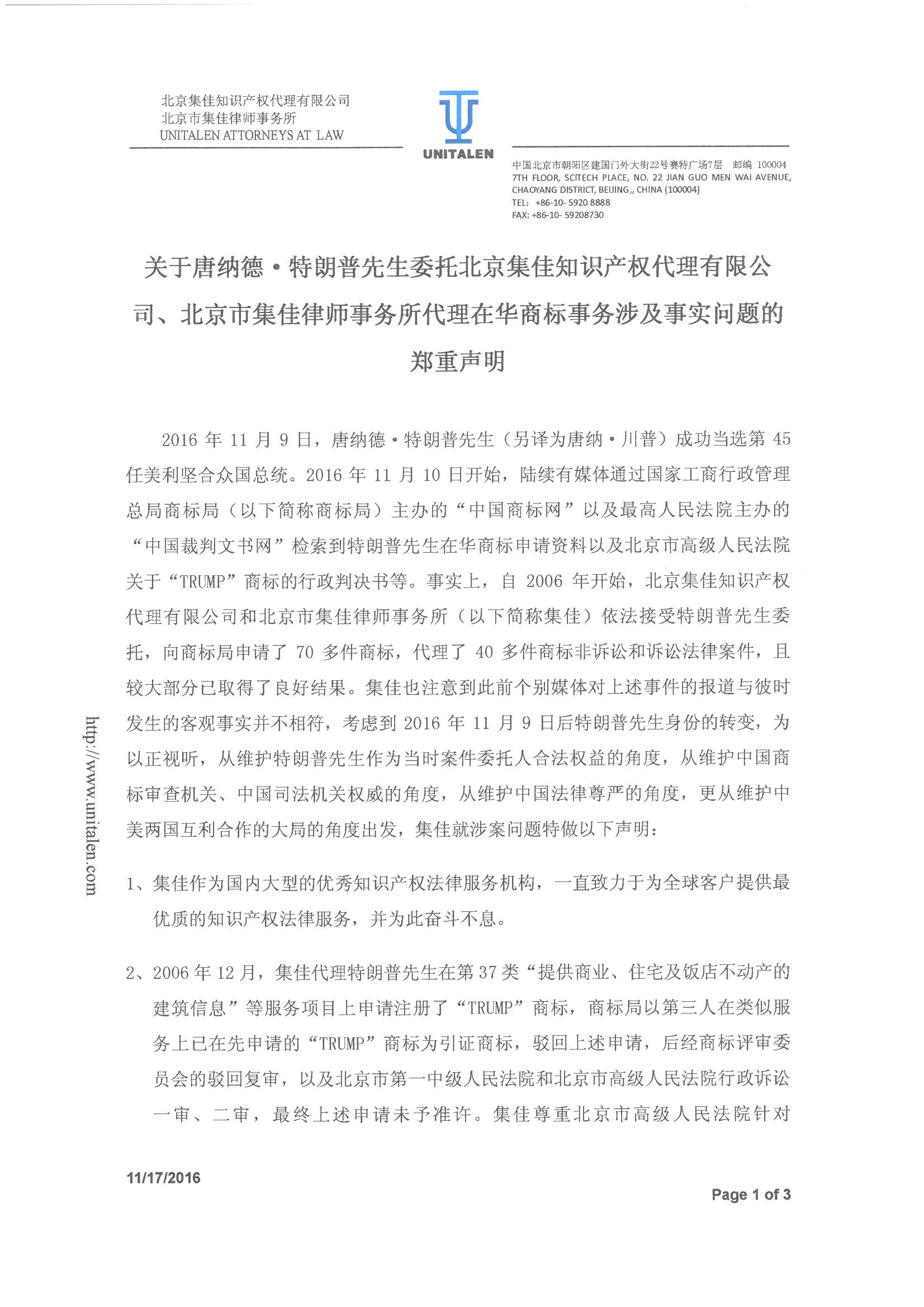 關于唐納德·特朗普先生委托北京集佳知識產(chǎn)權代理有限公司、北京市集佳律師事務所代理在華商標事務涉及事實問題的鄭重聲明 .pdf