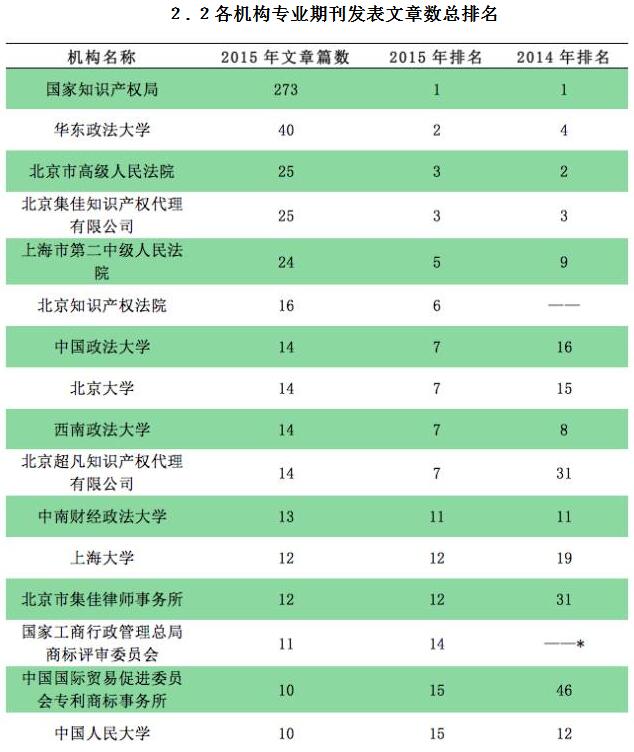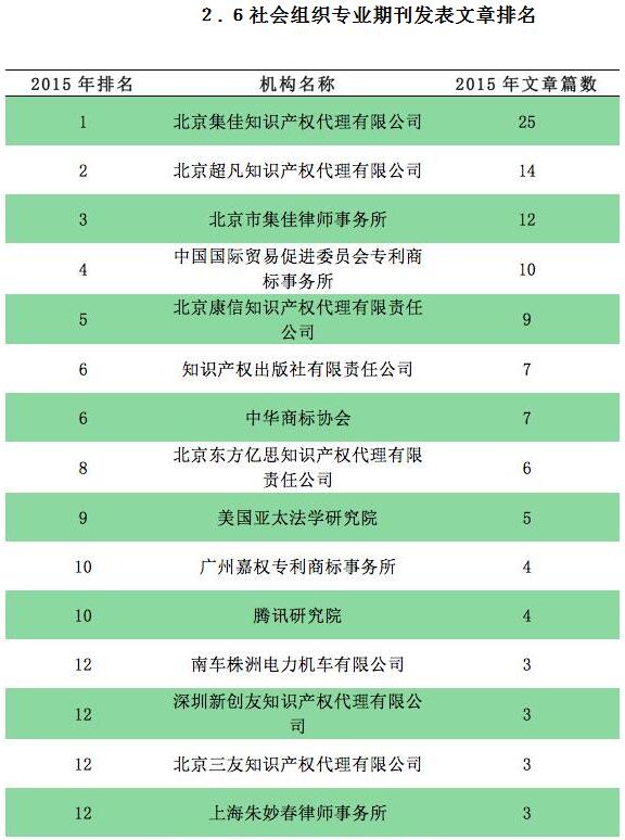 日前,上海知識(shí)產(chǎn)權(quán)研究所對(duì)2015年度我國知識(shí)產(chǎn)權(quán)專業(yè)文章發(fā)表情況進(jìn)行了統(tǒng)計(jì)分析,在包括科研院所、司法系統(tǒng)、政府部門、社會(huì)組織等各機(jī)構(gòu)文章發(fā)表總量排名中,集佳緊隨國家知識(shí)產(chǎn)權(quán)局、華東政法大學(xué)、北京市高級(jí)人民法院,以全年發(fā)表量25篇的成績(jī),領(lǐng)跑社會(huì)組織類機(jī)構(gòu)。此外,北京市集佳律師事務(wù)所以全年發(fā)表12篇的成績(jī)?cè)谏鐣?huì)組織類機(jī)構(gòu)排名中名列第三。