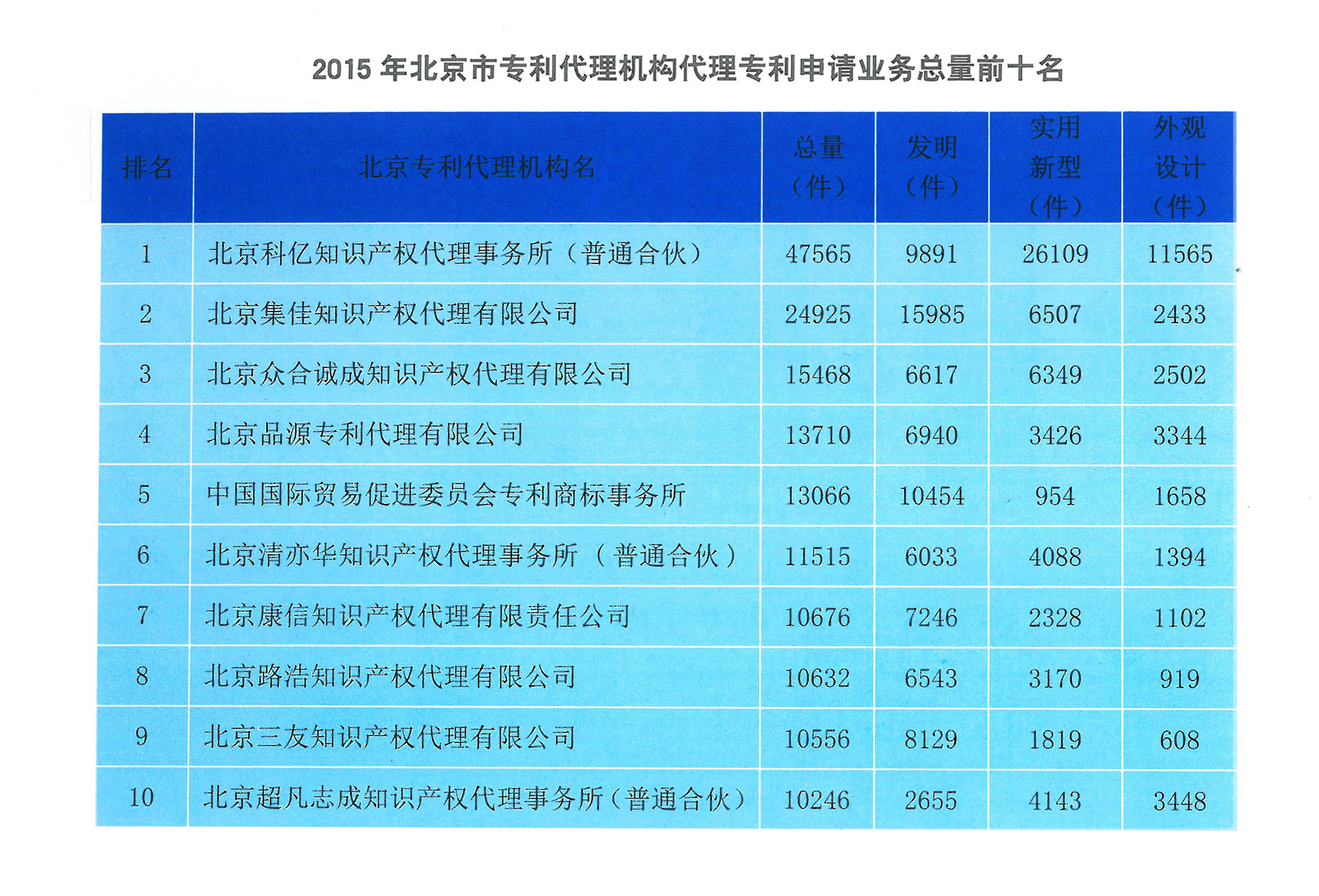 日前,北京市知識產權局發(fā)布了《2015年度北京市專利代理年報》,在北京專利代理機構業(yè)務排名中,集佳以代理量15985件的成績在發(fā)明專利申請量中再次排名第一,并在專利申請業(yè)務總量中排名第二。此外,經過專家評審,集佳憑借綜合的業(yè)務能力和優(yōu)質的專業(yè)服務,連續(xù)三年入選“北京市優(yōu)秀專利代理機構”。