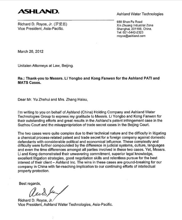2012年年初,集佳律師事務(wù)所李永波律師和孔繁文律師代理的美國亞什蘭公司擁有的“水包水型聚合物分散體的制造方法及其產(chǎn)品” 專利及商業(yè)秘密維權(quán)案件獲得全面勝利。近日,集佳收到由亞什蘭亞太區(qū)副總裁Richard D.Royce,Jr簽署的感謝信,感謝集佳一直以來對(duì)于本案的不懈努力,并對(duì)代理本案的李永波律師和孔繁文律師的辛勤付出表示感謝,對(duì)集佳全心全意為客戶服務(wù)的工作態(tài)度表示肯定。