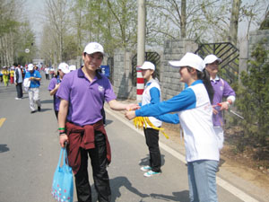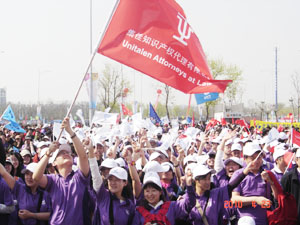 4月24日,天公十分作美。告別多日的陰霾,陽關(guān)盡情地普照著大地,仿佛也在迎接4?26的到來。感受著大自然的鳥語花香,每一位集佳的員工都神清氣爽。集佳方陣統(tǒng)一穿著組委會提供的紫色T恤,帶著繡有集佳標志的棒球帽,手里揮舞著集佳小旗,成為活動當天格外醒目耀眼的色彩,也吸引了眾多媒體的閃光燈。