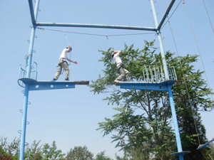 第二天一早,挑戰(zhàn)正式開始:動感顛球、驛站傳輸、移動高爾夫、不倒森林、高空斷橋、合力過橋……當(dāng)培訓(xùn)師將一個個項目公布后,大家發(fā)現(xiàn),只有認真分析隊員優(yōu)勢,合理分配資源,達到默契的協(xié)作和配合,而且中間環(huán)節(jié)沒有大的失誤和錯誤,才能完成任務(wù)。炎炎烈日下,雖然隊員當(dāng)中有的身寬體胖,有的恐高,有的身體協(xié)調(diào)能力差,但沒有一個被困難嚇倒,沒有一人被落下,“不拋棄、不放棄”成為每個隊員心中的信念。在隊長的帶領(lǐng)下,大家克服重重困難,團結(jié)協(xié)作,互相鼓勵,全部完成了挑戰(zhàn)任務(wù),而且有的團隊還通過完美的配合創(chuàng)造了破紀錄的佳績。