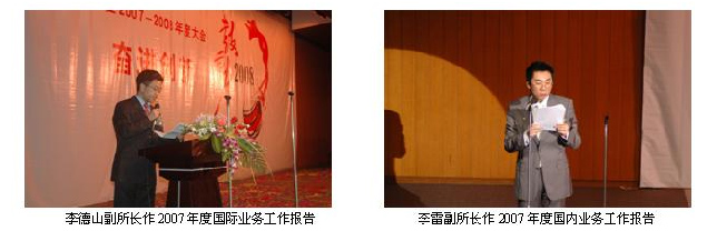 在振奮的年會開場后,集佳李德山副所長和李雷副所長分別作了2007年度國際業(yè)務(wù)和國內(nèi)業(yè)務(wù)工作報(bào)告。2007年集佳商標(biāo)申請量持續(xù)七年保持國內(nèi)第一,進(jìn)口、出口商標(biāo)代理量繼續(xù)快速增長,出口專利量仍保持中國最大的成績再一次印證了集佳扎實(shí)、穩(wěn)健、持續(xù)、快速的發(fā)展歷程,讓在場的每一個(gè)集佳人感到驕傲和振奮。而合伙人和初級合伙人的逐步增加,擁有了國內(nèi)最頂尖的電學(xué)代理人團(tuán)隊(duì)以及管理團(tuán)隊(duì)的高效運(yùn)轉(zhuǎn),更讓我們看到,集佳的理念和發(fā)展前景吸引了越來越多的精英共創(chuàng)偉業(yè)。