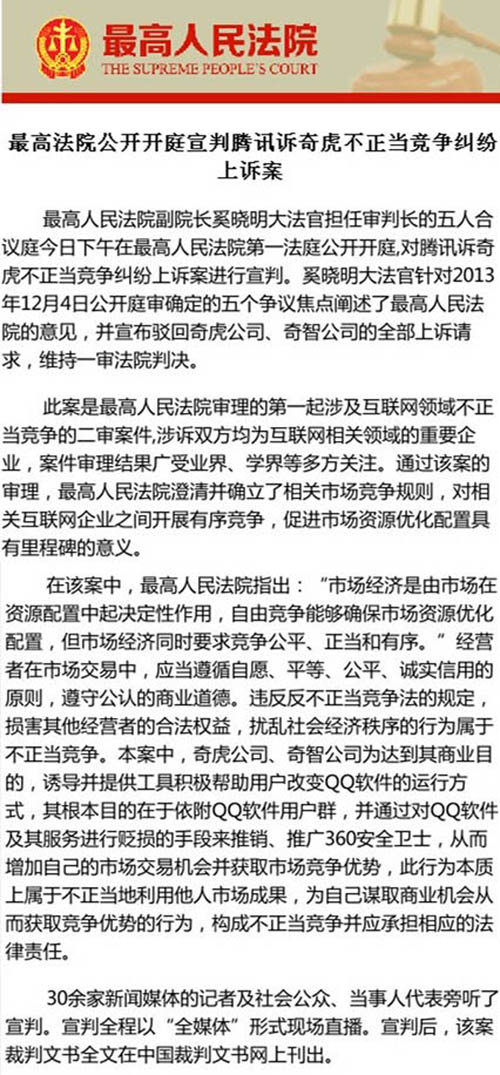 由北京市集佳律師事務(wù)所張亞洲律師、周丹丹律師代理的騰訊訴奇虎不正當(dāng)競(jìng)爭(zhēng)一案二審,于2014年2月24日下午,由最高人民法院副院長(zhǎng)奚曉明大法官擔(dān)任審判長(zhǎng)的五人合議庭在第一法庭公開開庭宣判,宣布駁回奇虎公司、奇智公司的全部上訴請(qǐng)求,維持一審法院判決。