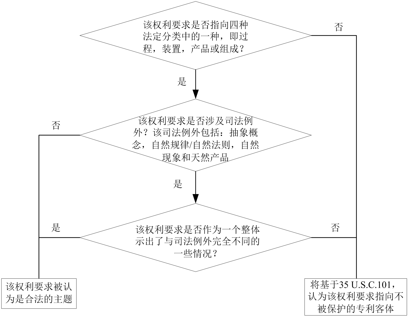 在審查過程中審查員通過三個步驟來判斷,一個權(quán)利要求是否屬于可專利的保護客體。如果最終的判斷結(jié)果是“否”,則這個權(quán)利要求初步認為是不合格的,其將被拒絕由于其不屬于可專利的保護客體。具體的判斷流程如下圖所示: