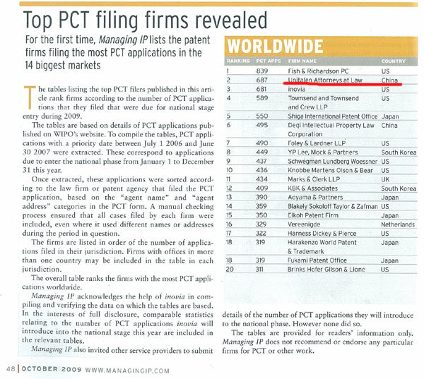 根據(jù)全球權(quán)威知識(shí)產(chǎn)權(quán)刊物Managing Intellectual Property (MIP)2009年10月期公布的一份數(shù)據(jù)顯示,全球PCT申請(qǐng)統(tǒng)計(jì)中,在申請(qǐng)日(優(yōu)先權(quán)日)介于2006年7月1日至2007年6月30日之間,30個(gè)月的絕限落在2009年1月至2009年12月間的已經(jīng)公開的PCT申請(qǐng)中,集佳知識(shí)產(chǎn)權(quán)代理有限公司以687件申請(qǐng)?jiān)谌虼頇C(jī)構(gòu)排名中僅次于一家美國(guó)事務(wù)所而位列第二,也是中國(guó)唯一一家躋身全球前五名的知識(shí)產(chǎn)權(quán)服務(wù)機(jī)構(gòu)。