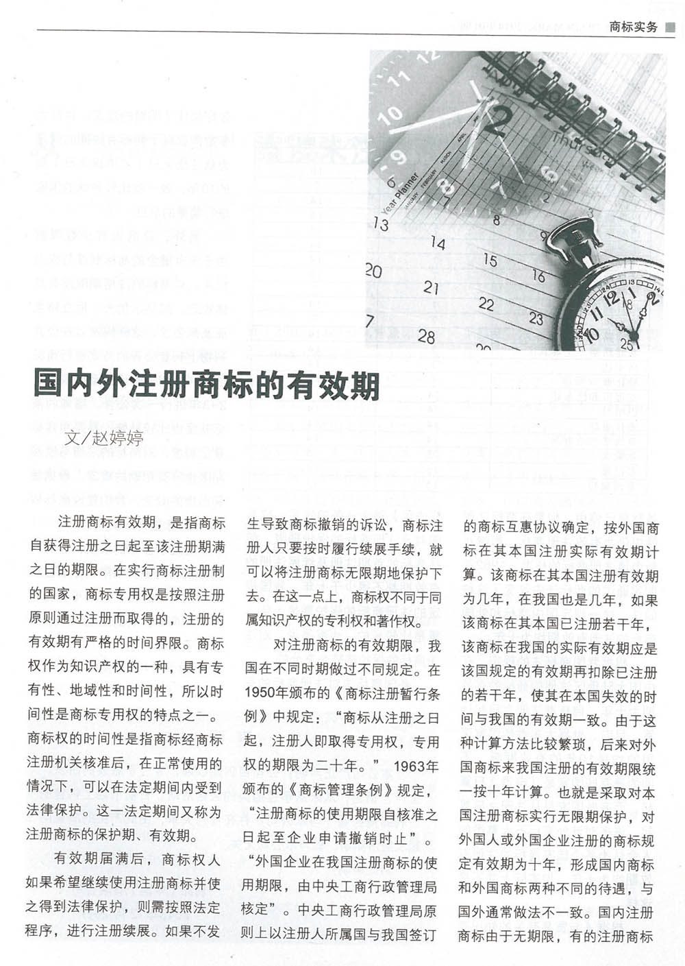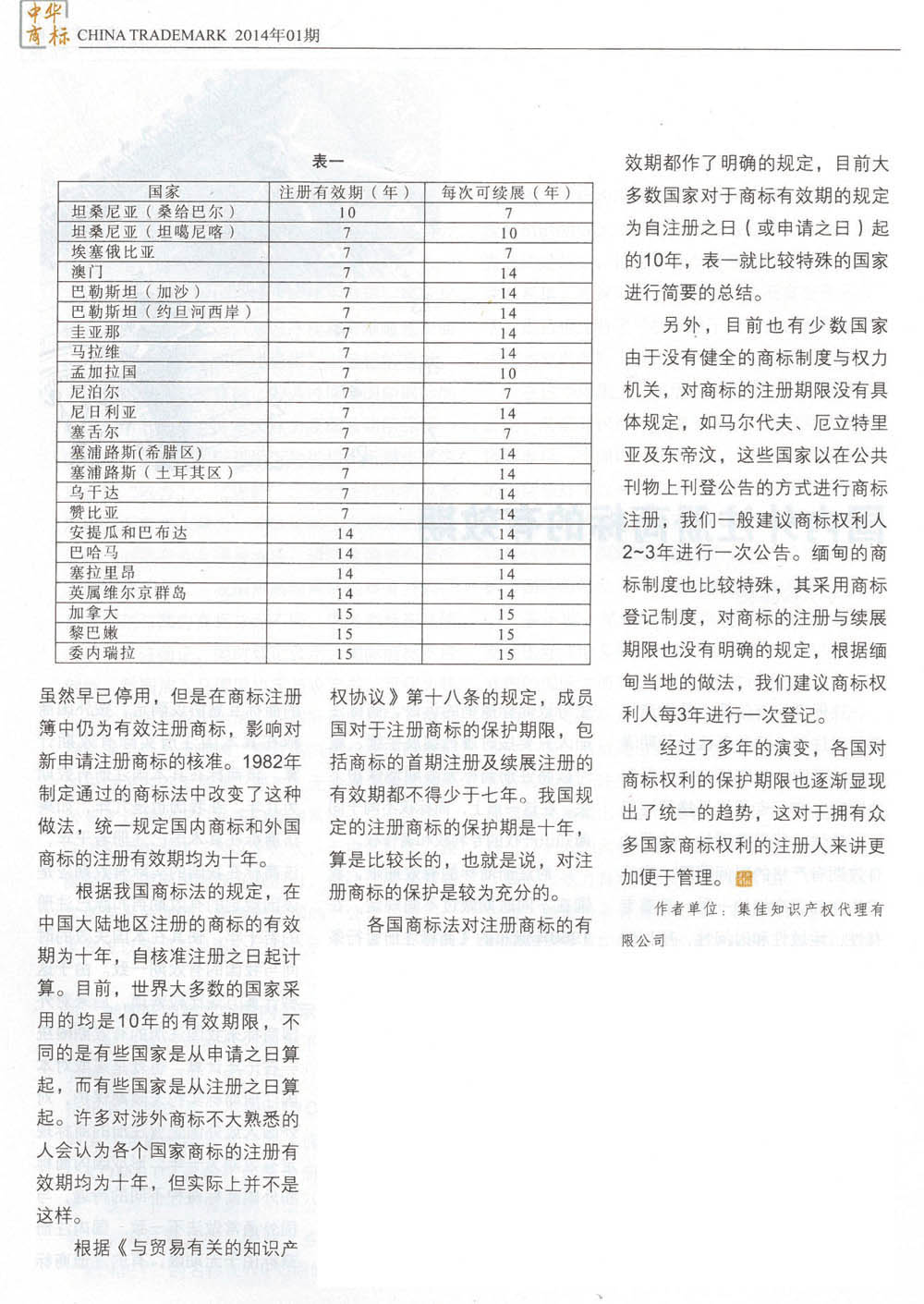 集佳代理人文章《國內(nèi)外注冊商標的有效期》在《中華商標》發(fā)表