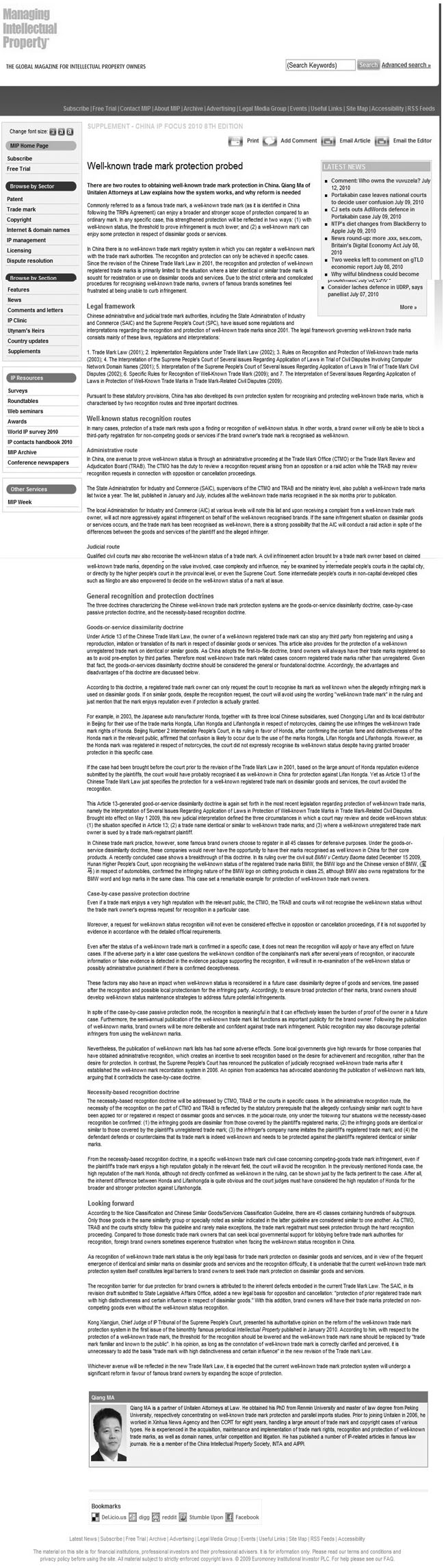 《Managing Intellectual Property》:Well-known trade mark protection probed