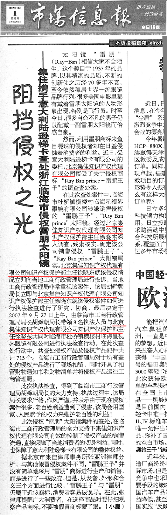 《市場(chǎng)信息報(bào)》:阻侵權(quán)之光——雷朋太陽(yáng)鏡打假維權(quán)