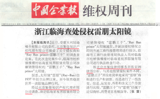 《中國(guó)企業(yè)報(bào)》:浙江臨海查處侵權(quán)雷朋太陽(yáng)鏡