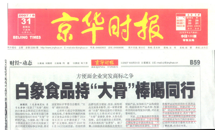 記者昨天通過中國商標(biāo)網(wǎng)查找發(fā)現(xiàn),白象集團(tuán)所屬的河南省正龍食品有限公司確于2004年8月31日申請注冊了“大骨”中文商標(biāo),商標(biāo)于2007年6月14日完成注冊,注冊的商品群包括方便面、掛面、面粉制品及面條米粉等。而一家要求撤消“大骨”商標(biāo)注冊的方便面企業(yè)相關(guān)人士昨天對記者表示,“大骨”是豬骨、排骨、大骨頭的俗稱,是行業(yè)通用的主要原料,不具有商標(biāo)的“顯著性”。據(jù)了解,目前很多企業(yè)都有大骨類方便面產(chǎn)品,如果相關(guān)產(chǎn)品構(gòu)成侵權(quán),將面臨更改產(chǎn)品名稱、包裝和宣傳內(nèi)容等復(fù)雜問題,對企業(yè)影響較大。