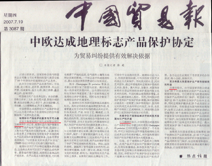 原文:《中歐達(dá)成地理標(biāo)志產(chǎn)品保護協(xié)定 為貿(mào)易糾紛提供有效解決依據(jù) 》