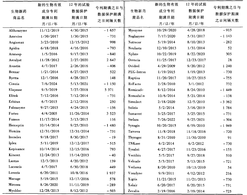 藥品數(shù)據(jù)保護(hù)制度,尤其是藥品數(shù)據(jù)獨(dú)占權(quán)模式的藥品數(shù)據(jù)保護(hù)制度,能夠顯著地彌補(bǔ)專(zhuān)利及其他保護(hù)形式的不足,推遲仿制藥的上市,為原研藥繼續(xù)保持合法的市場(chǎng)壟斷地位。眾所周知,專(zhuān)利保護(hù)對(duì)于原研藥而言是絕對(duì)的生命線(xiàn),但是隨著研發(fā)新藥的難度和投資成本越來(lái)越大,研發(fā)周期越來(lái)越長(zhǎng),始終保持不變的20年專(zhuān)利保護(hù)期(對(duì)于大多數(shù)國(guó)家而言)就越來(lái)越起到推動(dòng)原研藥廠(chǎng)商開(kāi)發(fā)新藥的作用,數(shù)據(jù)保護(hù)制度的出現(xiàn)在一定程度上解決了這一矛盾。有研究人員對(duì)2010年3月美國(guó)《生物技術(shù)制品價(jià)格競(jìng)爭(zhēng)與創(chuàng)新法》(Biologics Price Competition and Innovation Act,BPCIA)頒布后能夠享受數(shù)據(jù)保護(hù)的56個(gè)生物新藥進(jìn)行了研究,其中有接近一半的藥物在專(zhuān)利過(guò)期后仍然能享受數(shù)據(jù)保護(hù)所賦予的市場(chǎng)壟斷地位(見(jiàn)下表),其中最長(zhǎng)的接近十年7。