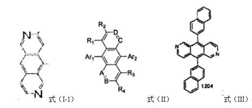 首先,確定審查意見所指出的共同結(jié)構(gòu)是否正確,根據(jù)上面所說的第一種觀點(diǎn),該申請的共同結(jié)構(gòu)即為審查意見中所指出的結(jié)構(gòu);根據(jù)第二種與第三種觀點(diǎn),將與母核吡啶并[3,4-g]異喹啉直接連接的變量R1、Q1與Q2引入共同結(jié)構(gòu)的確定,但R1可為氫原子、氰基、碳原子數(shù)是1~30的烷基、取代或未取代的碳原子數(shù)6~50的芳基、取代或未取代的碳原子數(shù)5~50的雜環(huán)基、取代或未取代的碳原子數(shù)7~30的芳香族胺基、取代或未取代的碳原子數(shù)7~30的芳烷氧基或取代或未取代的碳原子數(shù)7~30的芳烷巰基;這幾者對(duì)母核所產(chǎn)生的電子效應(yīng)、位阻效應(yīng)等影響各異,也不是本領(lǐng)域公知的同一化合物類別;L1與L2可以為0或1,Q1和Q2獨(dú)立的選自氮、氧、硫、碳原子數(shù)6~30的芳基或碳原子數(shù)1~30的雜環(huán)基,其中,氮、氧與硫原子,其為化學(xué)領(lǐng)域常指的雜原子,三者對(duì)母核的影響類似,可視為本領(lǐng)域中公認(rèn)的同一化合物類別,但其與芳基、雜環(huán)基差異較大,相互取代后,本領(lǐng)域技術(shù)人員并不能確定其能產(chǎn)生同樣的效果,因此不能視為同一化合物類別。由此可見,三種變量中各自所定義的可選擇的元素均不是本領(lǐng)域中公認(rèn)的同一化合物類別,將變量引入后的結(jié)構(gòu)也不是清楚和明確的,該申請的共同結(jié)構(gòu)只能是審查員所指出的吡啶并[3,4-g]異喹啉(式(I-1))。