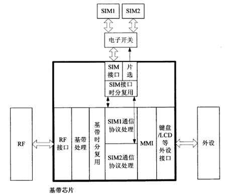 參照上圖,所述單套通信器件實(shí)現(xiàn)的雙卡雙待手機(jī)包括射頻模塊(RF)、基帶芯片、外設(shè)和兩個(gè)SIM卡槽(SIM1、SIM2),所述的基帶芯片具有SIM接口時(shí)分復(fù)用模塊和基帶時(shí)分復(fù)用模塊,以及SIM1通信協(xié)議處理模塊和SIM2通信協(xié)議處理模塊,所述的基帶芯片通過(guò)SIM接口跟一個(gè)同時(shí)連接兩個(gè)SIM卡槽的電子開(kāi)關(guān)相連,并通過(guò)片選模塊對(duì)電子開(kāi)關(guān)進(jìn)行控制。從而在一套手機(jī)硬件上實(shí)現(xiàn)雙卡同時(shí)待機(jī),減少了雙卡手機(jī)的體積,降低了成本,使用便捷。