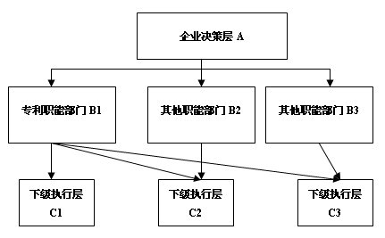職能式專利管理組織架構(gòu)明顯不同于直線式架構(gòu),其專利管理部門位階已經(jīng)與其他職能部門相同,專利管理部門與企業(yè)內(nèi)部的行政、技術(shù)研發(fā)、新產(chǎn)品推廣、戰(zhàn)略部門等平行設(shè)置。其最大的特點是,專利管理部門可以直接向其他職能部門的下級管理層下達(dá)任務(wù)并聽取匯報。這樣就克服了直線式專利管理組織架構(gòu)中因某一產(chǎn)品的專業(yè)性太強而帶來的種種弊端。專利管理部門在新產(chǎn)品研發(fā)過程中,其作用更加明顯,例如:企業(yè)決策層A下達(dá)“防漏電熱水器”技術(shù)公關(guān)給職能部門B2,由下級執(zhí)行層C2執(zhí)行,下級執(zhí)行層C2接到任務(wù)后向?qū)@芾聿块TB1匯報,該部門關(guān)注該技術(shù)攻關(guān)進(jìn)展,實時提供專利侵權(quán)檢索、規(guī)避涉及、專利申報、技術(shù)秘密保護等各方面服務(wù),做到避免重復(fù)研發(fā),防止未來侵權(quán)風(fēng)險等方面具有重大作用。