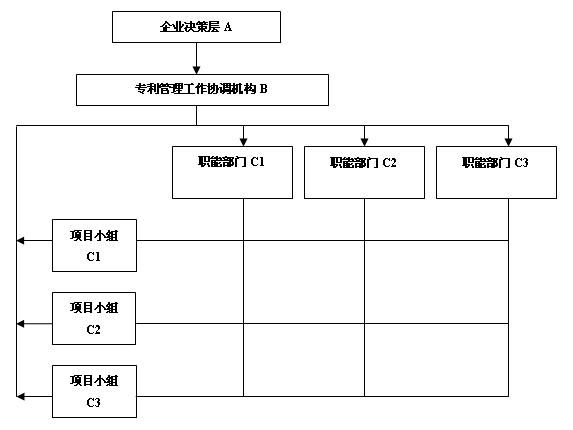 矩陣式專利管理組織架構(gòu)吸收了直線式和職能式組織架構(gòu)的優(yōu)點,并相應(yīng)的提高了專利管理層的位階,成為企業(yè)決策層的單獨協(xié)調(diào)機構(gòu)供企業(yè)發(fā)展決策參考,甚至參與企業(yè)發(fā)展戰(zhàn)略討論和決策。