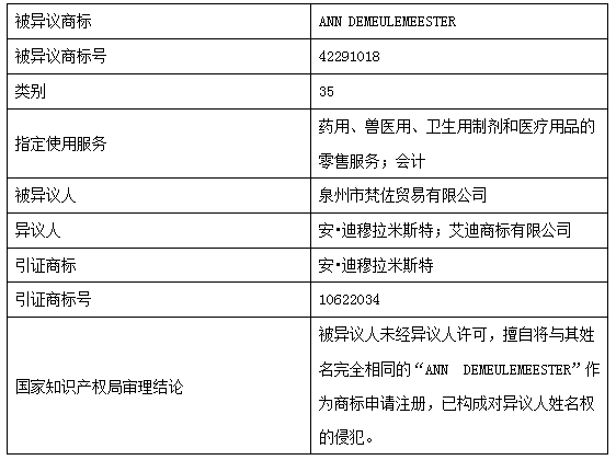 國(guó)家知識(shí)產(chǎn)權(quán)局經(jīng)審理本案認(rèn)為:被異議商標(biāo)“ANN DEMEULEMEESTER”指定使用于第35類(lèi)“藥用、獸醫(yī)用、衛(wèi)生用制劑和醫(yī)療用品的零售服務(wù);會(huì)計(jì)”等服務(wù)上。異議人引證在先注冊(cè)的第10622034號(hào)“安?迪穆拉米斯特”等系列商標(biāo)核定使用于第35類(lèi)“商業(yè)場(chǎng)所搬遷;文秘;會(huì)計(jì)”等服務(wù)上。雖然雙方商標(biāo)指定使用的部分服務(wù)相近,屬于類(lèi)似服務(wù),但雙方商標(biāo)文字構(gòu)成及整體外觀具有一定區(qū)別,未構(gòu)成近似商標(biāo),因此雙方商標(biāo)未構(gòu)成使用于類(lèi)似服務(wù)上的近似商標(biāo)。本案中,異議人稱(chēng)被異議人侵犯其姓名權(quán)并提供了如下證據(jù):異議人ANN DEMEULEMEESTER為世界知名時(shí)尚設(shè)計(jì)師,曾多次參加米蘭時(shí)裝周、巴黎時(shí)裝周等時(shí)尚頂級(jí)活動(dòng),同時(shí)異議人創(chuàng)辦的同名品牌“ANN DEMEULEMEESTER”在倫敦、巴黎、東京、香港、上海等地均有其專(zhuān)賣(mài)店,并在相關(guān)公眾中獲得了一定的影響力。上述證據(jù)可證明:異議人ANN DEMEULEMEESTER在時(shí)尚行業(yè)內(nèi)已具有一定知名度,為相關(guān)公眾所知曉。此外,ANN DEMEULEMEESTER獨(dú)創(chuàng)性極高,并非常見(jiàn)的外國(guó)姓名,且被異議商標(biāo)“ANN DEMEULEMEESTER”是普通字體的純英文商標(biāo),與異議人姓名在字母組成及呼叫上完全相同。被異議人未經(jīng)異議人許可,擅自將與其姓名完全相同的“ANN DEMEULEMEESTER”作為商標(biāo)申請(qǐng)注冊(cè),已構(gòu)成對(duì)異議人姓名權(quán)的侵犯。