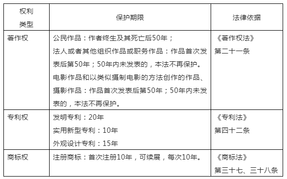 對于國家法律賦權(quán)的著作權(quán)、專利權(quán)、商標權(quán)等而言,其權(quán)利的期限都有明確的法律規(guī)定,具體可以參照下表。