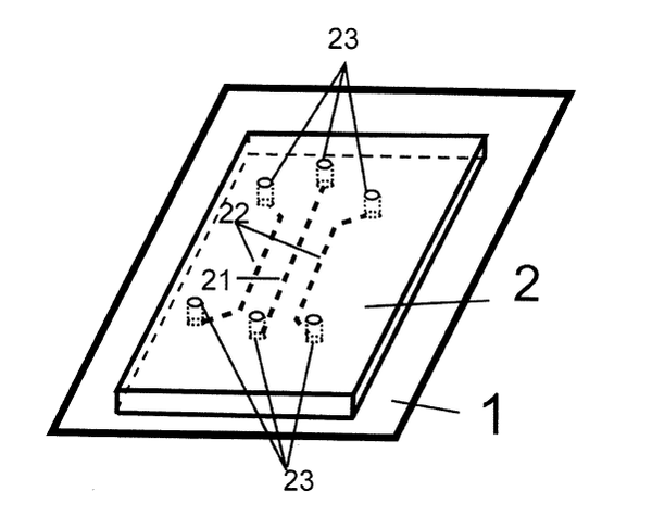 所述基底上表面上附著的蛋白條帶與所述聚二甲基硅氧烷印章的直線(xiàn)型中間凹槽和直線(xiàn)型側(cè)凹槽相交不重合。其裝置附圖如下(圖中21、22虛線(xiàn)即為凹槽,蛋白條帶未在圖中標(biāo)出,可直接理解為與21、22虛線(xiàn)垂直相交):