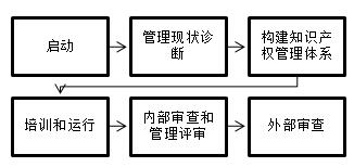 目前貫標輔導咨詢,市場份額占比較大的有兩種模式:一種是基于咨詢機構提供的一套符合國家標準的模板,企業(yè)根據知識產權的自身運作形成記錄文件后爭取第三方認可;另一種,是在咨詢機構的全程輔導下,完成啟動、管理現(xiàn)狀診斷、構建知識產權管理體系、培訓和運行、內部審查和管理評審、外部審查6個模塊(見圖1),系統(tǒng)的構建知識產權管理體系。