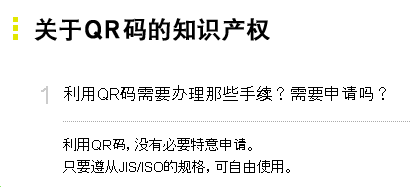 DENSO公司擁有QR Code二維碼的專利權(quán),但明確表示不會行使已形成標(biāo)準(zhǔn)(ISO/IEC 18004)的QR碼相關(guān)權(quán)利2。