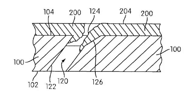 對比文件1教導(dǎo)的是一種再次敞開計量孔的方法,其用于舊構(gòu)件的翻新或再處理。也就是說,冷卻孔120的翼狀槽126(擴寬部)在施加熱障涂層200之前就已經(jīng)存在于原有制品100中。這類似于本申請圖2中所示的現(xiàn)有技術(shù)。