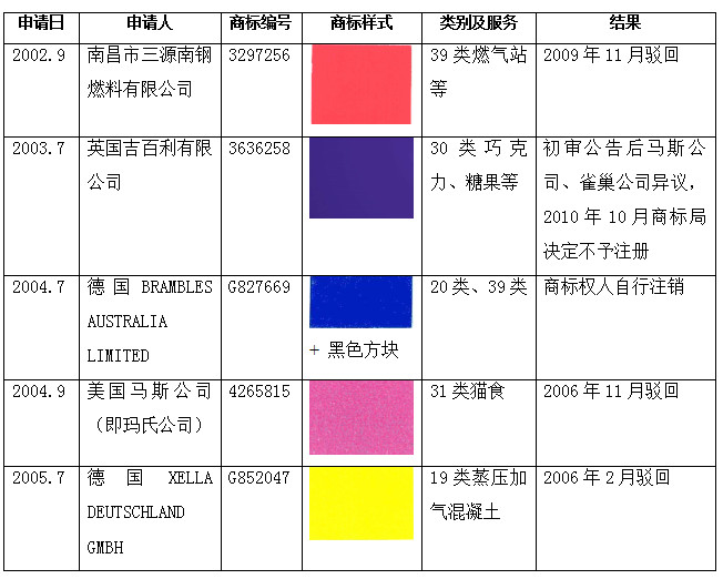 我國現(xiàn)有的商標(biāo)法將單一顏色排除在被列舉的可予注冊標(biāo)志的范圍之外。作為成文法國家,由于沒有明確的法律授權(quán),商標(biāo)審查機(jī)關(guān)在實(shí)踐中實(shí)際上排除了單一顏色作為商標(biāo)注冊的可能性。我國擁有世界上第二大商標(biāo)注冊簿,但至今尚無一例單一顏色申請獲準(zhǔn)注冊。如下圖所示,自2002年起就至少有5件單一顏色商標(biāo)注冊申請,首次提出單一顏色申請的并非外國企業(yè)而是江西南昌某石油化工企業(yè);但除了英國吉百利有限公司的注冊申請?jiān)怀鯇徆?、但隨后由于他人異議決定不予注冊之外,對于其他單一顏色的注冊申請,商標(biāo)局均是直接予以駁回。