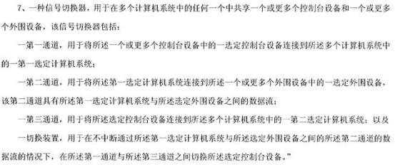 第三,從發(fā)明目的來看,本專利所要解決的技術問題是提供一種信號切換器,其在將一個或多個外圍設備切換到不同的計算機系統(tǒng)的同時,不中斷流向所述一個或多個外圍設備的數據流。而對比文件1所要解決的技術問題是提供在多個USB主機之間共享外圍設備,允許多個用戶使用鍵盤、監(jiān)視器、鼠標和一組USB外圍設備的同時訪問多個計算機,而且同時支持計算機之間的文件傳送裝置,因此,D1中沒有給出關于上述區(qū)別技術特征的任何技術啟示。