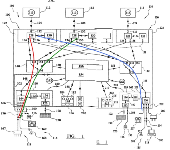 請求人認為:D1公開了設置于USB切換設備100內部的USB切換裝置140、142(兩個切換裝置對應于涉案專利的特征E的切換裝置),并且,在切換裝置142保持與最左側計算機122以及外圍設備207連通的情況下(即第二(藍色)通道不中斷數據流),所述切換器140可以通過向下游連接146在最左側向上游連接144(即第一(紅色)通道)和中間向上游連接144(即第三(綠色)通道)之間切換。
