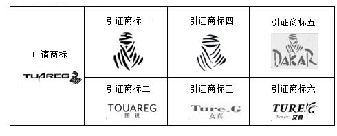 經(jīng)評審認(rèn)為,申請商標(biāo)與商標(biāo)局駁回時(shí)所引證的第5110766號(hào)圖形商標(biāo)(以下稱引證商標(biāo)一)、第4100562號(hào)“圖銳TOUAREG”商標(biāo)(以下稱引證商標(biāo)二)、第1741769號(hào)“女真Ture.G”商標(biāo)(以下稱引證商標(biāo)三)、第3882012號(hào)圖形商標(biāo)(以下稱引證商標(biāo)四)、國際注冊第606861號(hào)“DAKAR及圖”商標(biāo)(以下稱引證商標(biāo)五)、第9487138號(hào)“女真TURE.G Ture gir1及圖” 商標(biāo)(以下稱引證商標(biāo)六)在文字構(gòu)成、呼叫上存在一定差異,未構(gòu)成使用在同一種或類似商品上的近似商標(biāo)。依照《中華人民共和國商標(biāo)法》第二十八條的規(guī)定,最終決定:申請商標(biāo)的注冊申請予以初步審定。
