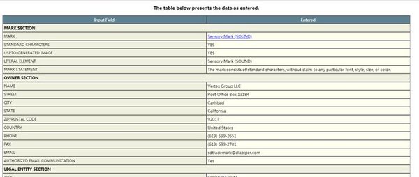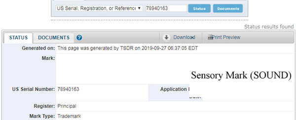 聲音商標在官網(wǎng)的頁面上顯示為SENSORY MARK (SOUND),其在申請文件頁面的Mark部分為一段音軌,具體如下: