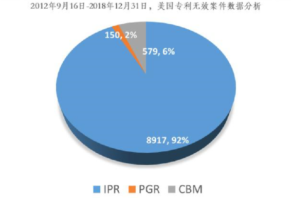 5、根據(jù)USPTO(美國(guó)專(zhuān)利商標(biāo)局)公布的2012年9月16日至2018年12月31日美國(guó)專(zhuān)利無(wú)效案件數(shù)據(jù),在IPR、PGR、CBMR三種無(wú)效(復(fù)議)程序中,IPR占比最多,高達(dá)92%,合計(jì)為8917件;IPR較少,占比僅為2%,合計(jì)150件。從目前的數(shù)據(jù)觀(guān)察,IPR是上述三種無(wú)效(復(fù)議)程序中最受歡迎的方式。
