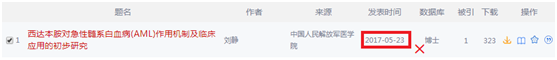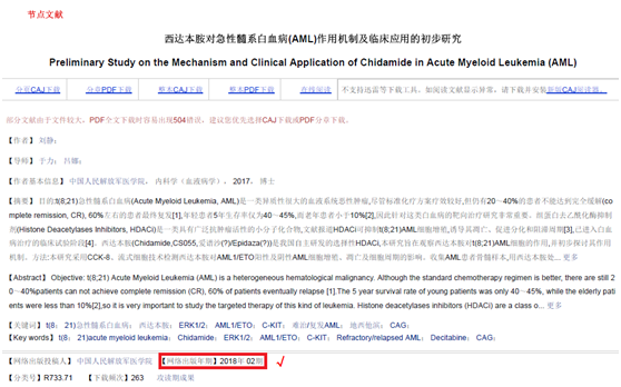 CNKI網(wǎng)頁顯示的“發(fā)表時間”并非該論文的公開日。實際上,CNKI只是將論文首頁記載的日期(答辯日期)登記為“發(fā)表時間”,并錄入數(shù)據(jù)庫中,但并不對此進行核實。論文首頁記載的答辯日期類似于送審日期(或收稿日期)。任何一篇文章或論文在網(wǎng)絡(luò)刊物或期刊雜志上公開發(fā)表之前,都會送審,因而都有一個送審版本,該送審版本可能是電子版或紙本,該送審版本都需要發(fā)送或遞交給網(wǎng)絡(luò)刊物或期刊雜志聘請的專家進行審稿,審稿通過后才能公開發(fā)表。許多網(wǎng)絡(luò)刊物或期刊雜志都會在發(fā)表的文章中記載送審日期或收稿日期。這些送審日期與發(fā)行日期是不同的日期。例如,“DCAG聯(lián)合HLA不相合的干細胞輸注治療老年初發(fā)急性髓系白血病的療效觀察”這篇論文的送審日期是2014年4月9日,但是其發(fā)行日期是2015年3月。因此,通常送審日期要早于發(fā)行日期。