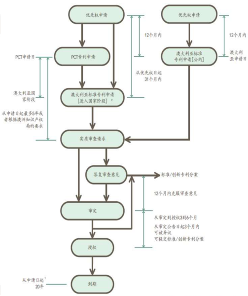 標(biāo)準(zhǔn)專利:可以通過PCT/CP提交澳大利亞標(biāo)準(zhǔn)專利新申請,并在5年內(nèi)提出實質(zhì)審查(PCT從PCT國際申請日起算,CP從澳大利亞申請日起算)。在收到第一次審查意見后12個月內(nèi)克服所有缺陷,克服缺陷后進入審定,審定后3-6個月授權(quán)。標(biāo)準(zhǔn)專利保護期限是20年(藥物、藥品專利保護期限為25年)。