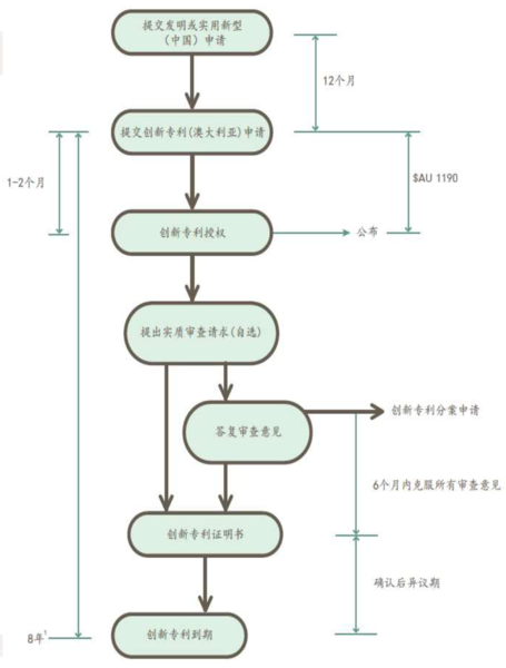 創(chuàng)新專利:可以通過CP提交澳大利亞標(biāo)準(zhǔn)專利新申請;如果是通過PCT途徑的話,不能直接提交創(chuàng)新專利,而是需要以PCT申請為基礎(chǔ)提交分案申請進入澳大利亞;或者以標(biāo)準(zhǔn)專利進入國家階段,然后再通過轉(zhuǎn)換類型或者提分案得到創(chuàng)新專利申請。實審不是必須的,如果提了實審,那么在收到第一次審查意見后6個月內(nèi)需克服所有缺陷,克服缺陷后進入審定,審定后3-6個月授權(quán)。創(chuàng)新專利保護期限是8年。