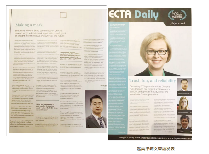 本次年會上,趙雷律師與世界各國知識產(chǎn)權(quán)界同仁探討當(dāng)前熱點(diǎn)話題和商標(biāo)發(fā)展趨勢,尋求廣泛的合作,同時(shí)也與參會代表分享了集佳近年來在國內(nèi)商標(biāo)領(lǐng)域及境外商標(biāo)實(shí)踐中取得的成績和獲得的經(jīng)驗(yàn),并與很多國家的代表建立了廣泛友好的業(yè)務(wù)聯(lián)系。此外,作為ECTA互聯(lián)網(wǎng)委員會委員,趙雷律師應(yīng)邀參加了互聯(lián)網(wǎng)委員會會議,與世界各國專家同仁就世界范圍內(nèi)互聯(lián)網(wǎng)領(lǐng)域的知識產(chǎn)權(quán)問題進(jìn)行了深入探討。會議期間,趙雷律師撰寫的文章《Making a mark》在會刊《ECTA Daily》發(fā)表,受到客戶和業(yè)界同仁的好評。