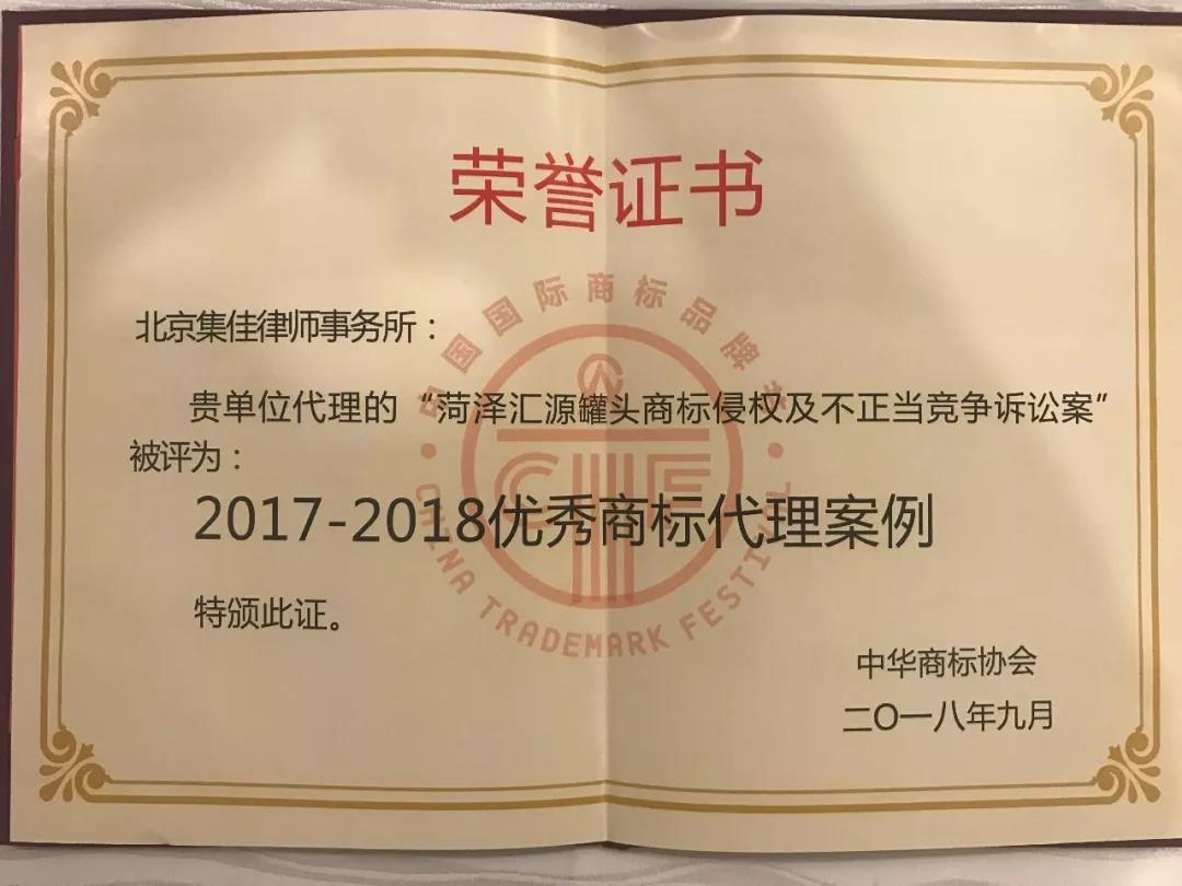 2018中國國際商標品牌節(jié)進行到第二日,又一令人期待的獎項頒布了。中華商標協(xié)會梳理和回顧了過去一年商標領域發(fā)生的重大典型事件、案件,從參加申報的眾多商標代理案例中評選出了26件年度商標典型案例,以此樹立優(yōu)秀案例標桿,發(fā)揮示范指導效應。集佳律師事務所代理的“菏澤匯源罐頭商標侵權及不正當競爭訴訟案”成功入選“2017-2018優(yōu)秀商標代理案例”。