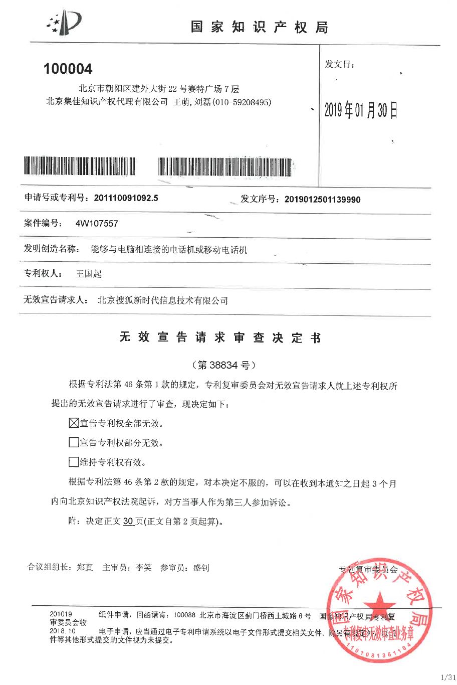 由于存在諸多特殊性,本案受到行業(yè)的高度關注。集佳公司接受搜狐公司委托,組建經驗豐富的專利無效團隊,團隊成員深知該案的重要性,以高標準嚴要求的態(tài)度認真對待無效過程中的每個環(huán)節(jié),從前期對比文件檢索,到無效請求材料的準備,證據(jù)的補充,以及后期的口頭審理,承委托人之信任,擔盡力成事之責任,終于實現(xiàn)了委托人搜狐的期望,在新年來臨之前,收到復審委做出的無效決定。