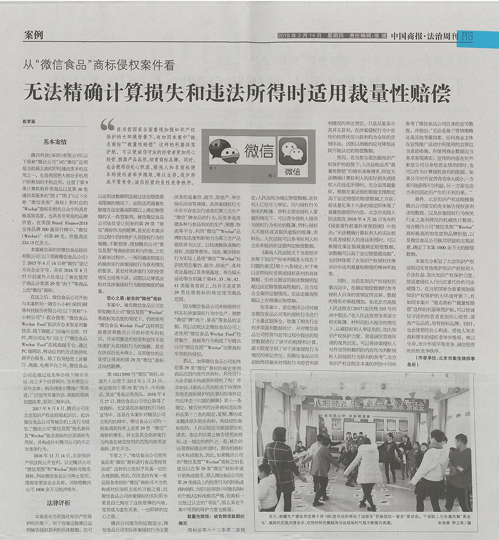 集佳文章《從“微信食品”商標(biāo)侵權(quán)案件看無法精確計(jì)算損失和違法所得時(shí)使用裁量性賠償》在《中國商報(bào)》發(fā)表