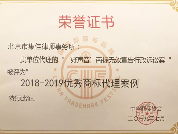 7月6日,第十一屆中國(guó)國(guó)際商標(biāo)品牌節(jié)在銀川正式拉開帷幕,各項(xiàng)活動(dòng)如火如荼地進(jìn)行著。在商標(biāo)典型案例評(píng)析論壇上,集佳再獲嘉獎(jiǎng),由集佳代理的“好聲音”商標(biāo)無效宣告行政案被評(píng)為“2018-2019優(yōu)秀商標(biāo)代理案例”。