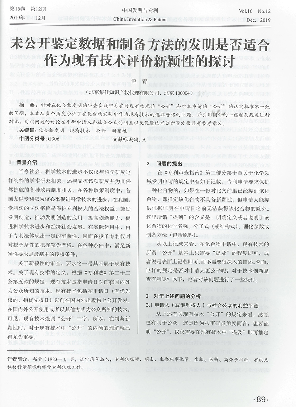 集佳文章《未公開鑒定數(shù)據(jù)和制備方法的發(fā)明是否適合作為現(xiàn)有技術(shù)評價新穎性的探討》在《中國發(fā)明與專利》 發(fā)表