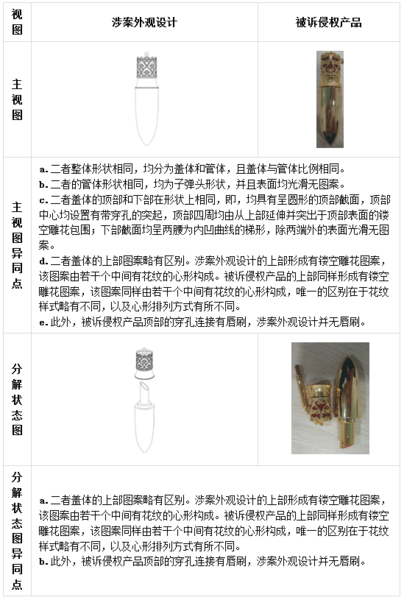 3、經(jīng)過比對,被訴侵權(quán)產(chǎn)品設(shè)計(jì)與涉案專利的確存在以下兩點(diǎn)區(qū)別,即:(1)蓋體上鏤空雕花的具體圖案略有不同;(2)頂部穿孔處是否連接有唇刷。