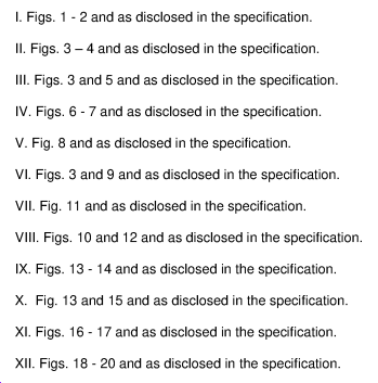 通過(guò)列出的權(quán)利要求與附圖的對(duì)應(yīng)關(guān)系表格,即可以清楚地確定不同的子類對(duì)應(yīng)的權(quán)利要求。例如,申請(qǐng)人選擇了 Species XII,其對(duì)應(yīng)權(quán)利要求有1,2,3,5…。在這種情況下,建議選擇的同時(shí)一并進(jìn)行反駁,從而在所選擇的權(quán)利要求授權(quán)之后,也可以重新加入其他未選擇的無(wú)沖突的權(quán)利要求。