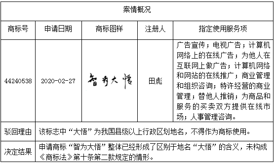 其次,“大悟縣”雖然是隸屬于湖北省孝感市轄區(qū)下的一個(gè)縣級(jí)城市名稱(chēng),但其作為縣級(jí)城市名稱(chēng)并不被廣大消費(fèi)者所熟知,當(dāng)普通消費(fèi)者看到“大悟”二字時(shí),想到是“大悟”二字本身的固有含義,而能夠聯(lián)想到“大悟縣”的可能性不高,其不太可能被普通消費(fèi)者誤認(rèn)是行政區(qū)劃名稱(chēng)。